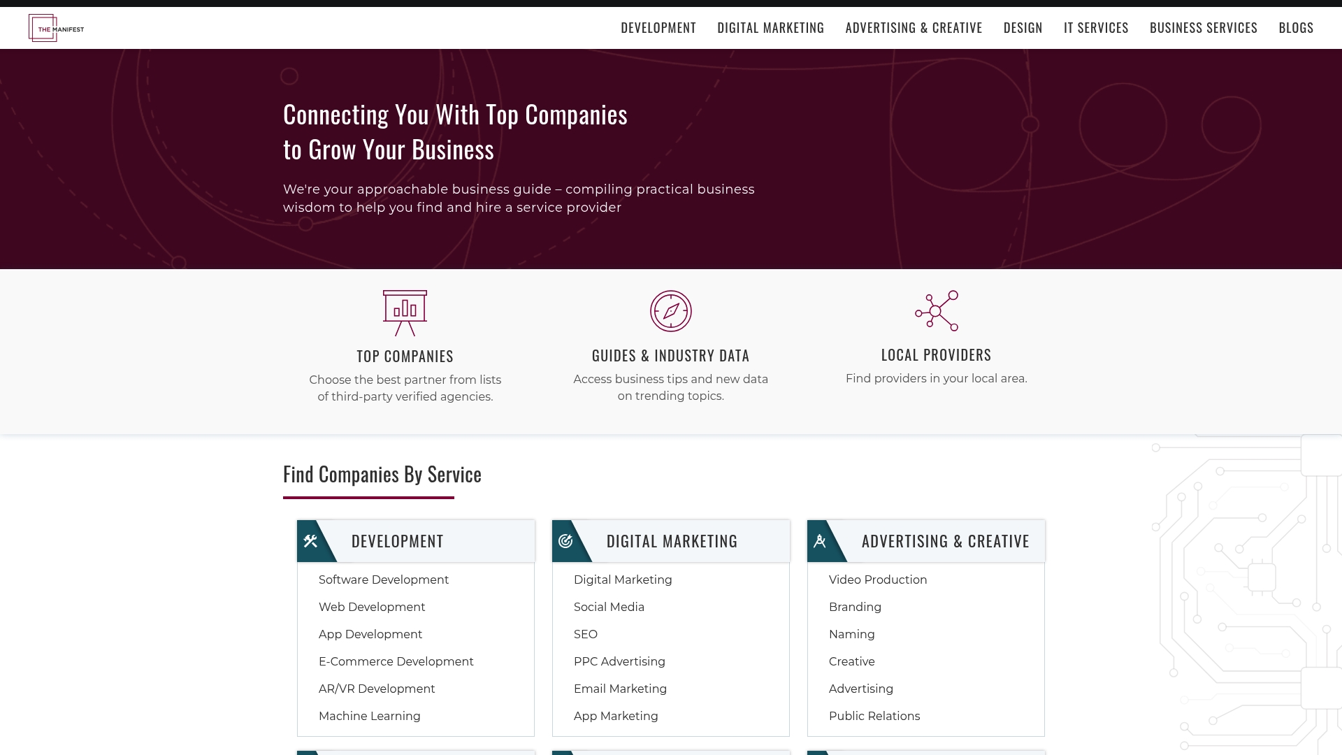 The Manifest свързва бизнеси с проверени доставчици в сферата на уеб, маркетинг и ИТ услуги и дава достъп до индустриални данни и статии, които помагат при избора на партньор. Кратко и практично за собственици на малък бизнес.