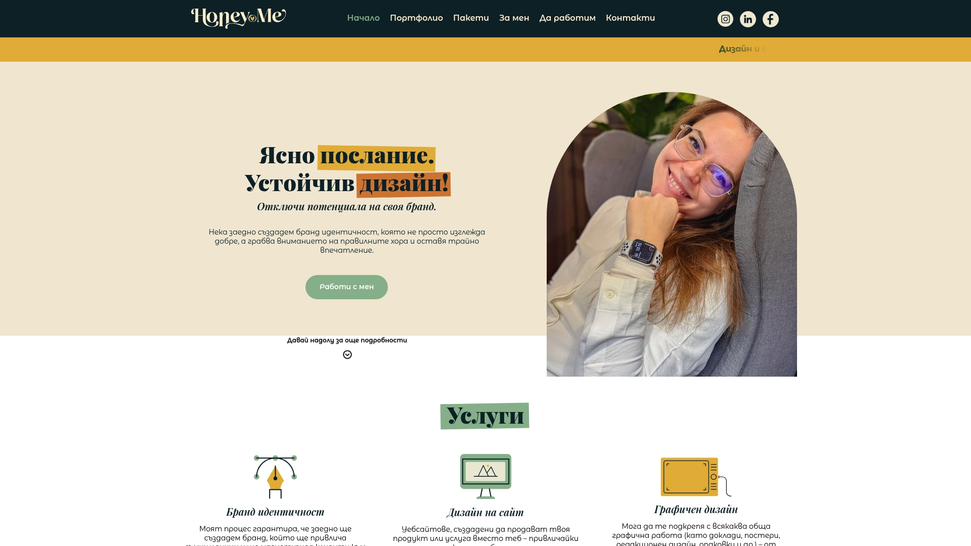 Honey.Me предлага индивидуален и стратегически подход към бранд идентичност и уеб дизайн, воден от Сияна. Услугите са фокусирани върху визуална идентичност за Instagram и уеб решения, които да представят бизнеса професионално и привлекателно.