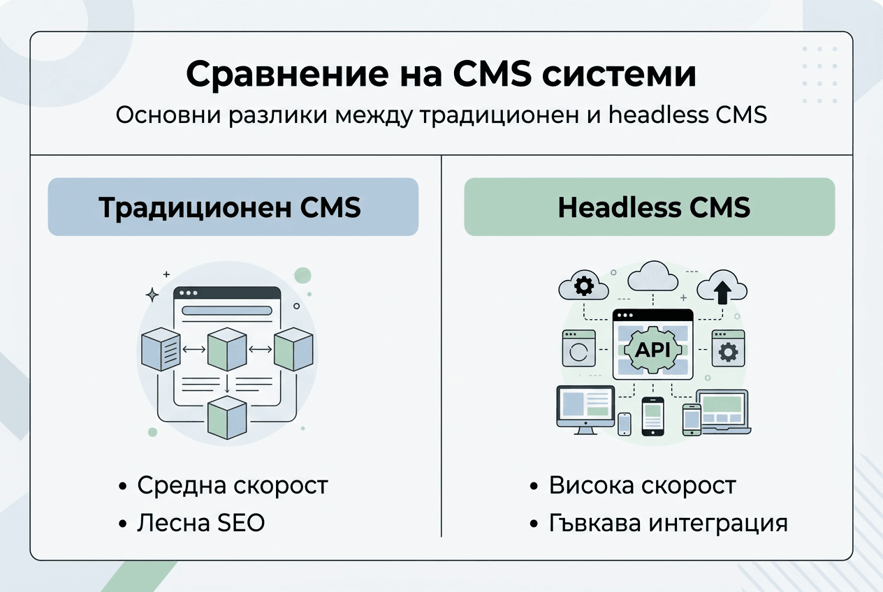 | Избор между традиционен и headless CMS | Влияе директно върху SEO резултатите, скоростта и гъвкавостта на сайта. |