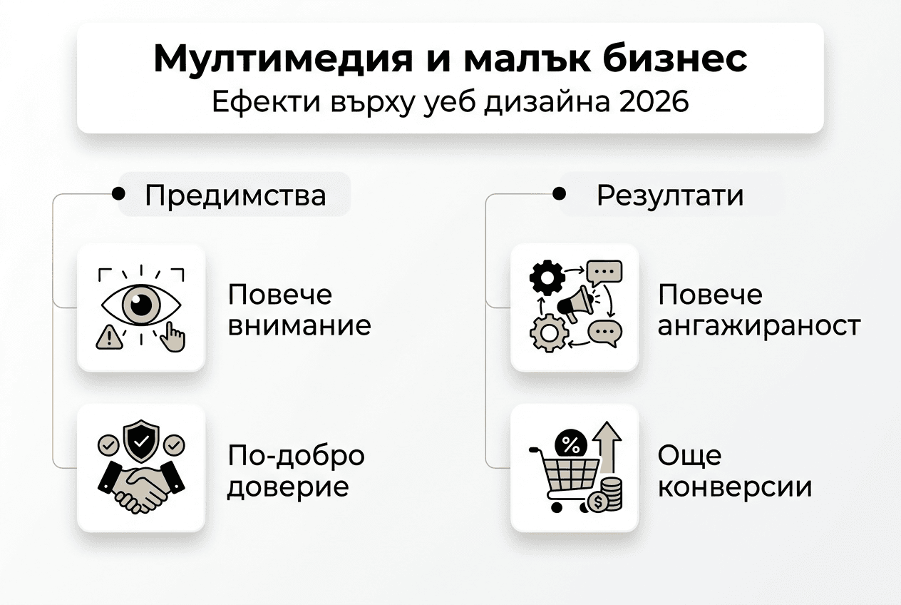 Интеграцията на мултимедия увеличава ангажираността с 30 до 50% и конверсиите с 10 до 20 процента. Това са измерими резултати, които оправдават инвестицията. За малък бизнес в България, където конкуренцията в онлайн пространството нараства, мултимедията е начин да се отличите.